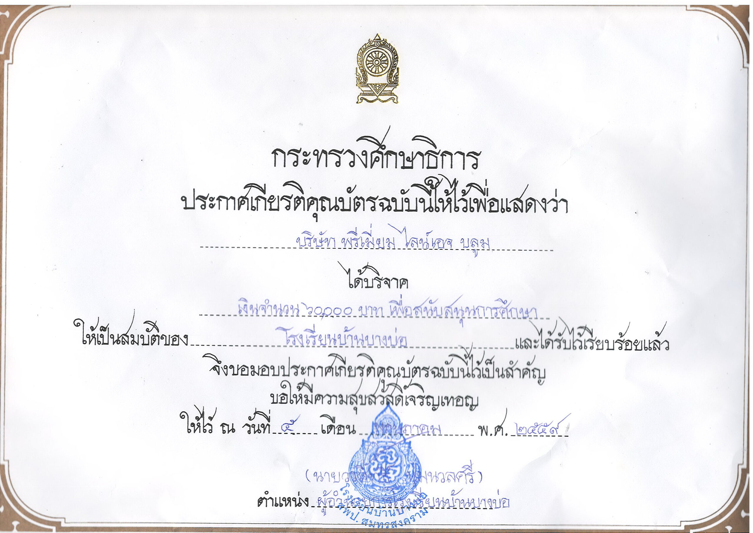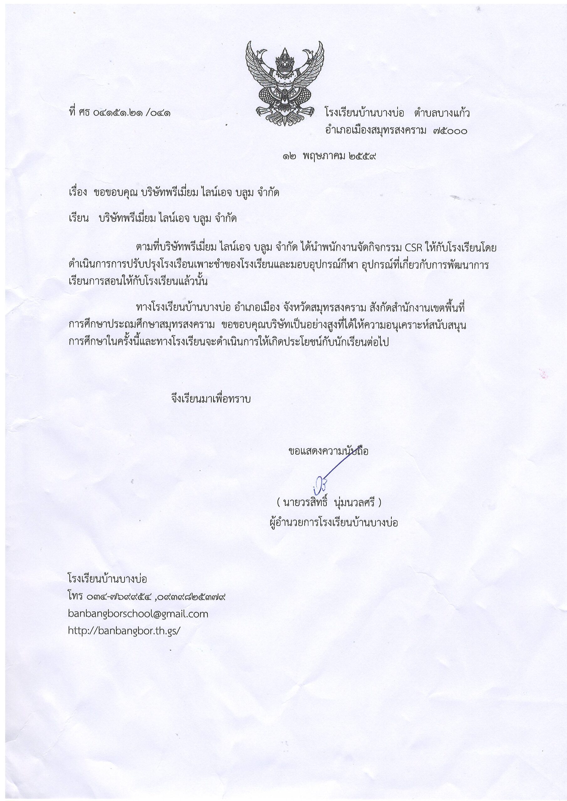 ข้อมูลกิจกรรม : ทางบริษัทได้ดำเนินการสร้างเรือนเพาะชำ และบริจาคสิ่งของที่โรงเรียนจำเป็นต้องใช้ในการสนับสนุนการเรียนการสอนกับนักเรียนในโรงเรียนได้แก่ บริจาคตู้กดน้ำเย็นและร่มสนามให้กับทางโรงเรียนบ้านบางบ่อ